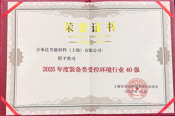 万事达深耕洁净室围护系统解决方案,精准响应生物医药、电子半导体、食品、实验室等领域的受控环境对洁净度、气密性、温湿度精准控制及长期运行稳定性的核心需求,凭借高性能、高可靠性的节能净化材料与系统方案,引领行业向更安全、节能、可持续的方向升级发展。此次荣获“装备类受控环境行业40强”,正是对我们在洁净室、实验室、医疗环境等高端受控环境领域围护系统技术实力与解决方案能力的高度认可。