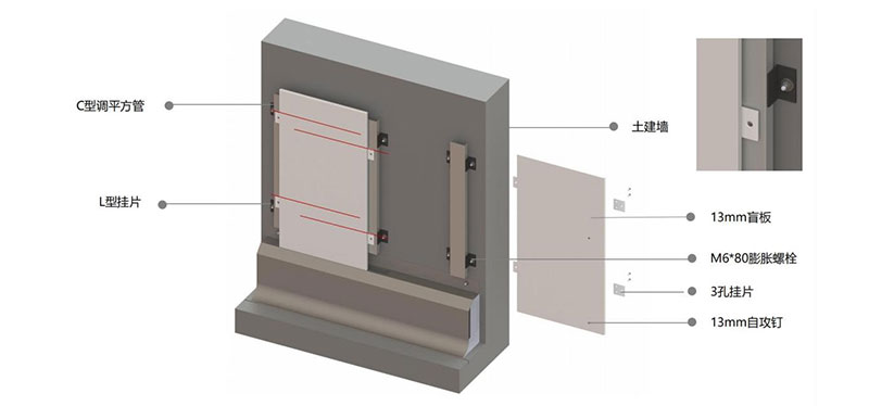 装配式金属内装挂板隔断墙是一种装卸方便、安全环保的新型隔断墙体,由15mm厚挂板和龙骨组成。其中挂板结构是由双层0.5mm厚彩涂板和石膏、铝蜂窝复合而成,搭配三孔挂片进行密插组成的装配式内装隔墙。